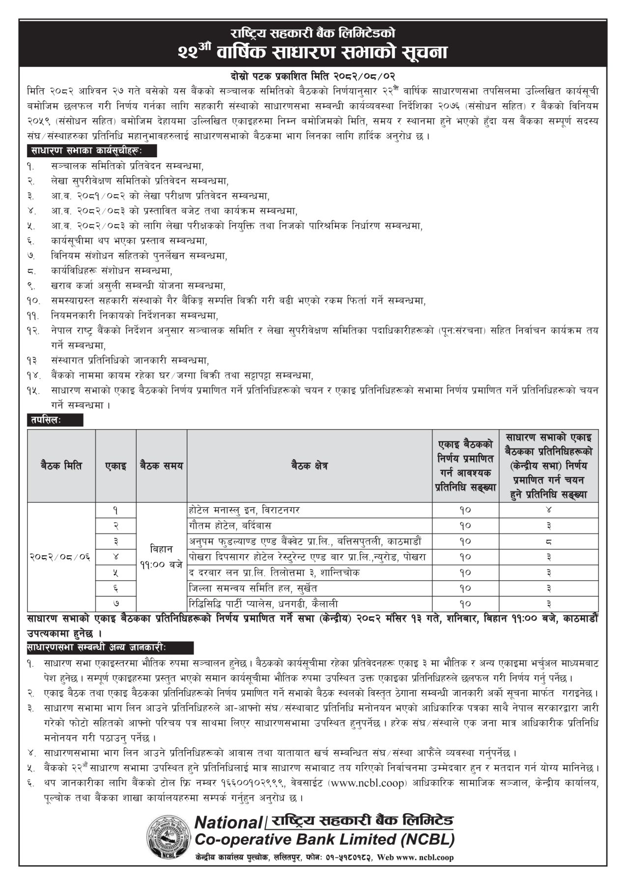 काठमाडौँ। राष्ट्रिय सहकारी बैंक लिमिटेडले २२औं वार्षिक साधारण सभा आह्वान गरेको छ।